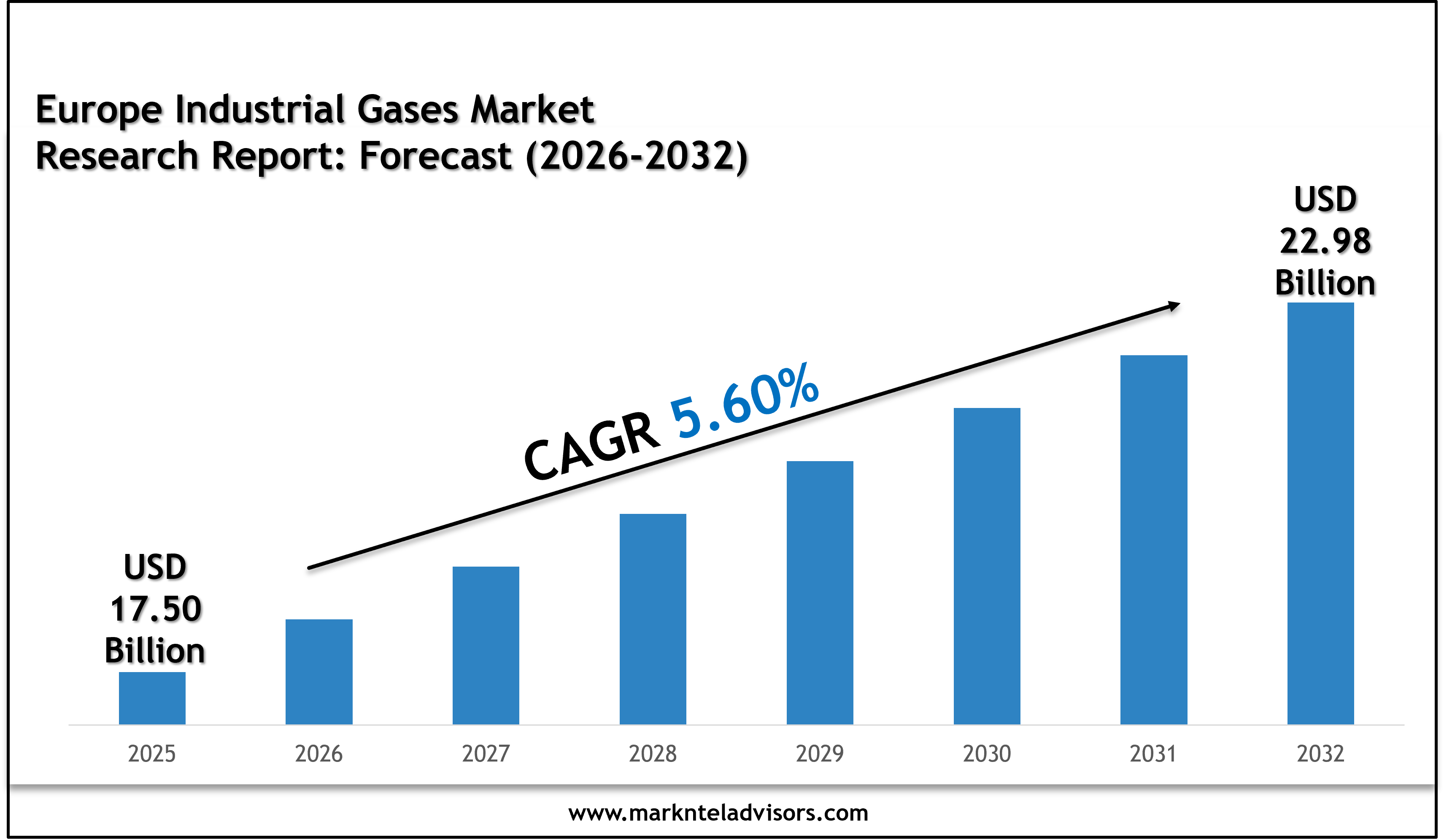 The Europe Industrial Gases Market size is valued at around USD 17.50 billion in 2025 and is projected to reach USD 22.98 billion by 2032. Along with this, the market is estimated to grow at a CAGR of around 5.60% during the forecast period, i.e., 2026-32.